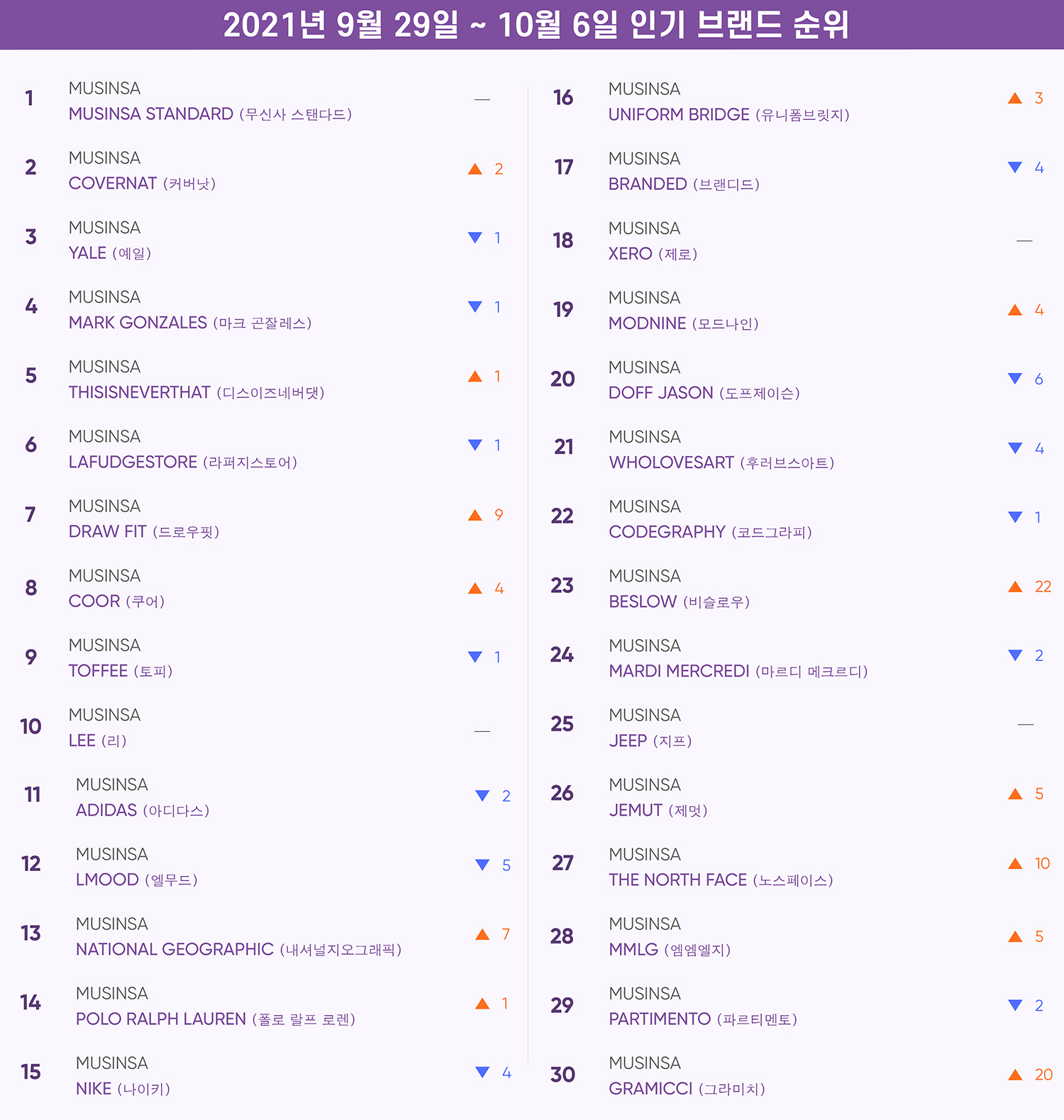 27위 노스페이스가 10계단 상승한 걸 보면 겨울이 오고 있음을 알 수 있습니다. 지난 한 주 노스페이스에서 가장 큰 인기를 누린 제품은 신제품 롱 패딩. 역시 패딩과 플리스 재킷의 인기가 상승하는 중이며, 내셔널지오그래픽과 함께 겨울 아우터가 강세를 보이는 대표적인 캐주얼 브랜드로 제철을 맞아 특수를 누릴 것으로 예상됩니다.