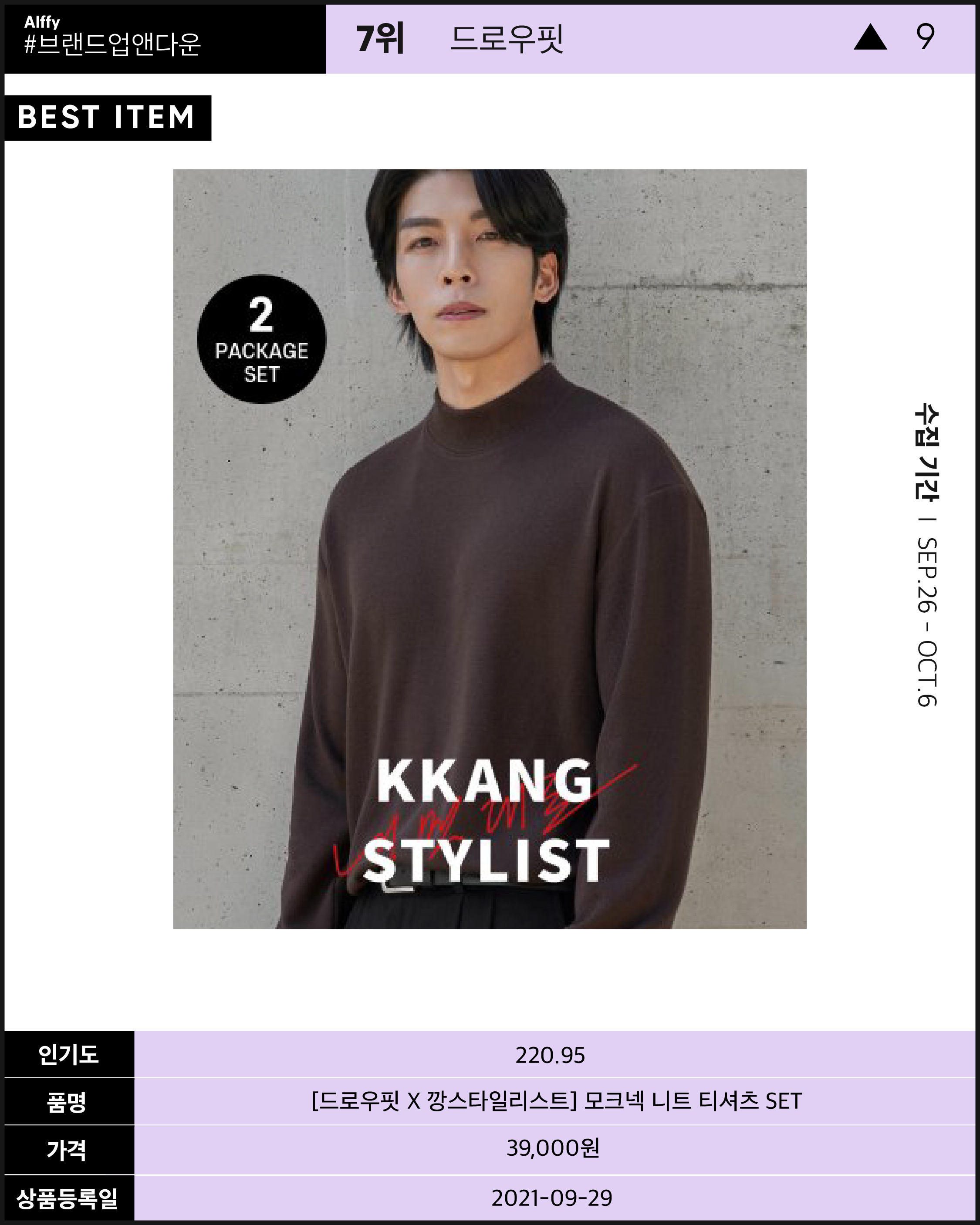 7위에 랭크된 드로우핏은 9계단 상승했습니다. 9월 29일에 출시한 가을 신상품, 니트 티셔츠가 컬러별로 큰 인기를 끌면서 순위 상승에 결정적 역할을 했습니다. 스타일리스트 유튜버와 협업한 제품으로 홍보 영상이 15만 뷰 이상의 조회 수를 기록합니다.