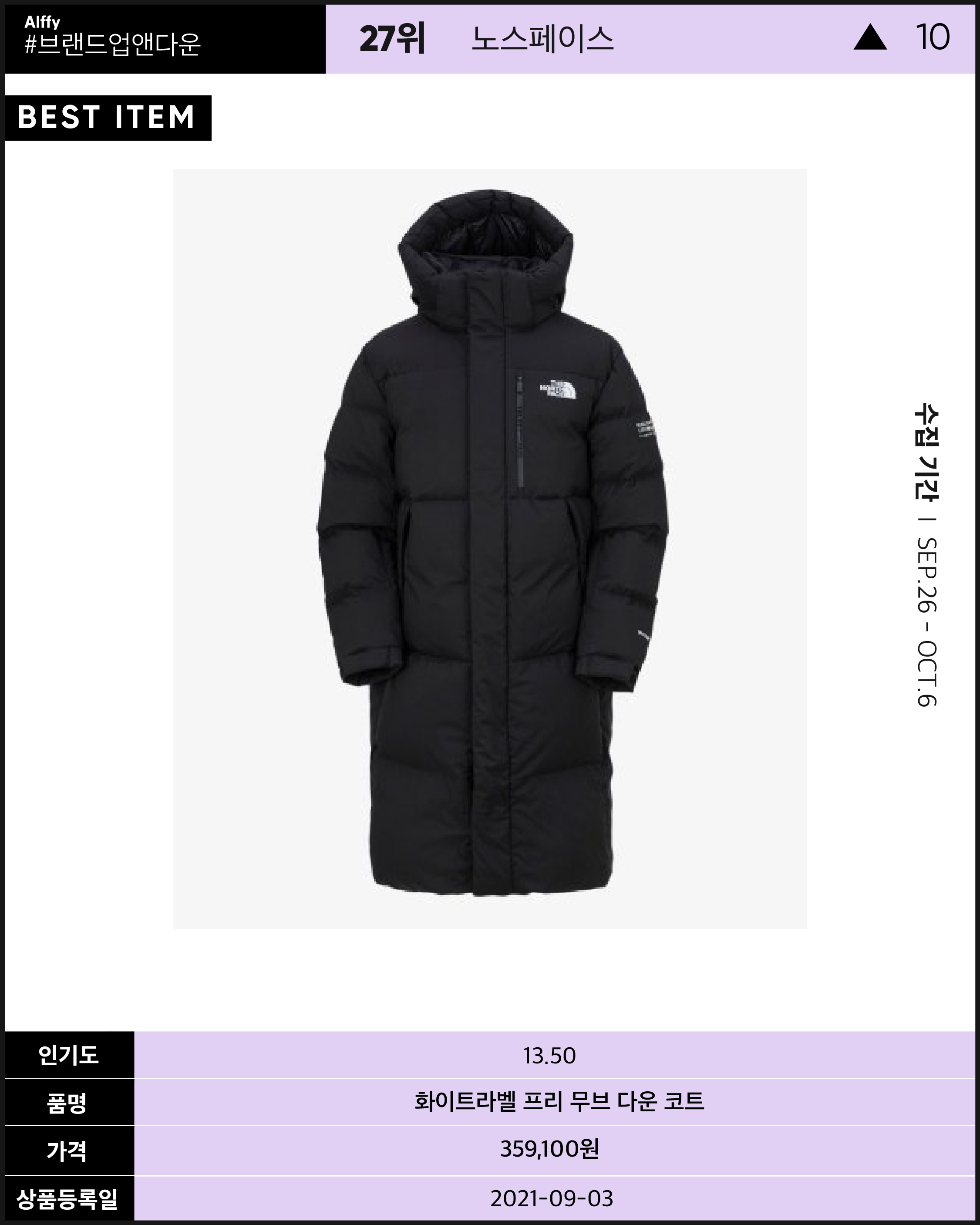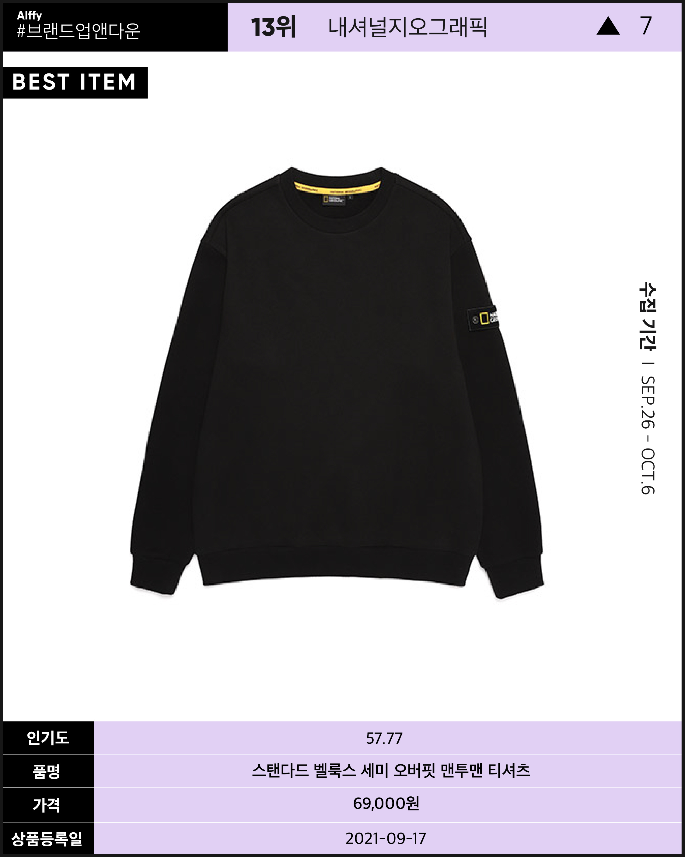 13위 내셔널지오그래픽은 7계단 상승했습니다. 한정 판매하는 신제품 스웨트 셔츠가 조사 기간 중 가장 큰 인기를 누렸습니다. 스웨트셔츠의 뒤를 이어 패딩과 플리스 재킷 또한 인기가 상승하고 있어 날씨가 추워질수록 좋은 결과를 낼 것으로 보입니다.