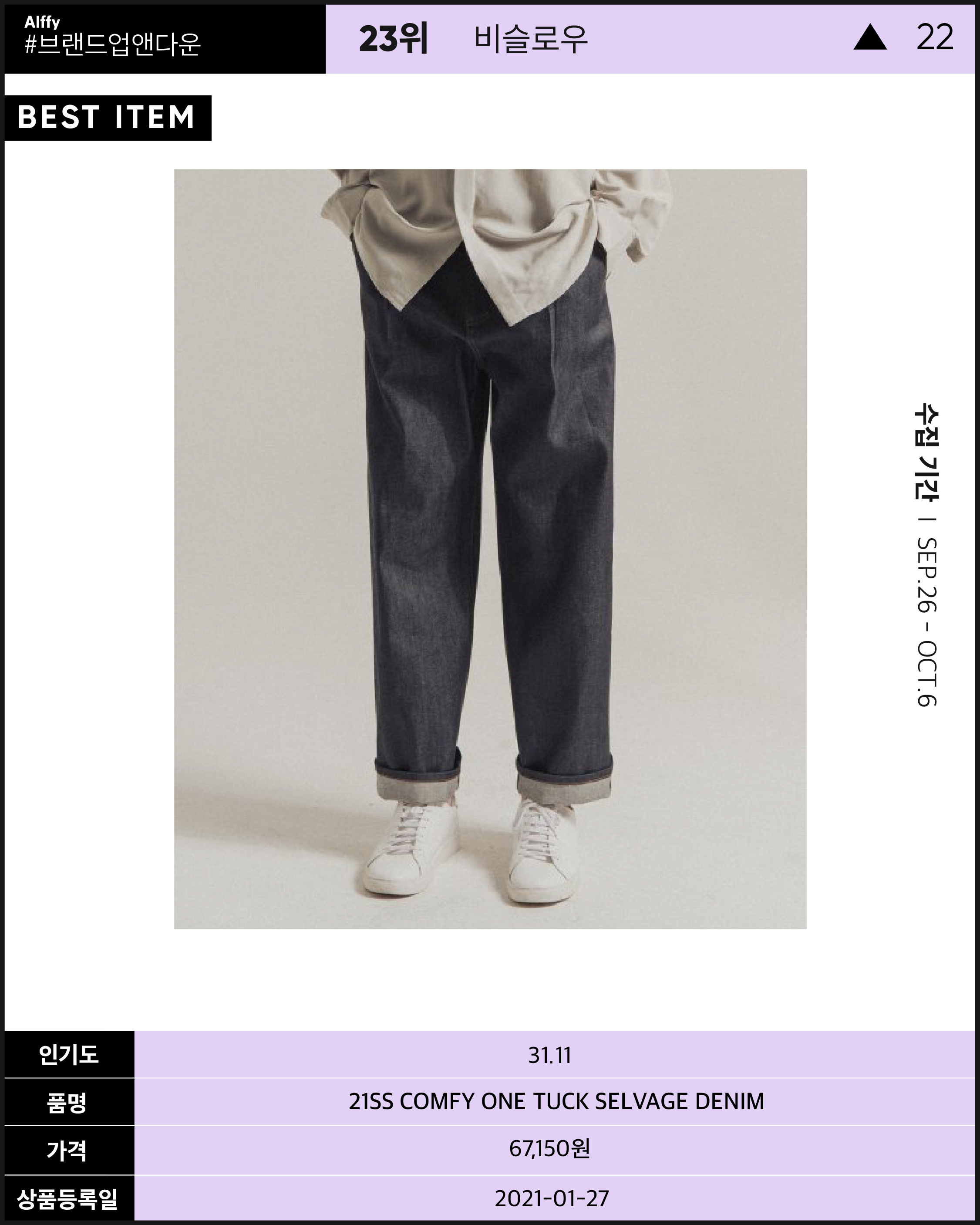 23위 비슬로우는 무려 22계단이나 상승했습니다. 비슬로우 브랜드 내 인기 순위를 확인해보면 바지 맛집이라는 걸 알 수 있는데요. 특히 셀비지 데님 팬츠 라인이 디자인과 컬러별로 고른 인기를 누리고 있습니다. 브랜드 내 인기 순위 1위를 차지한 제품의 경우 핏이 좋다는 평이 다수.