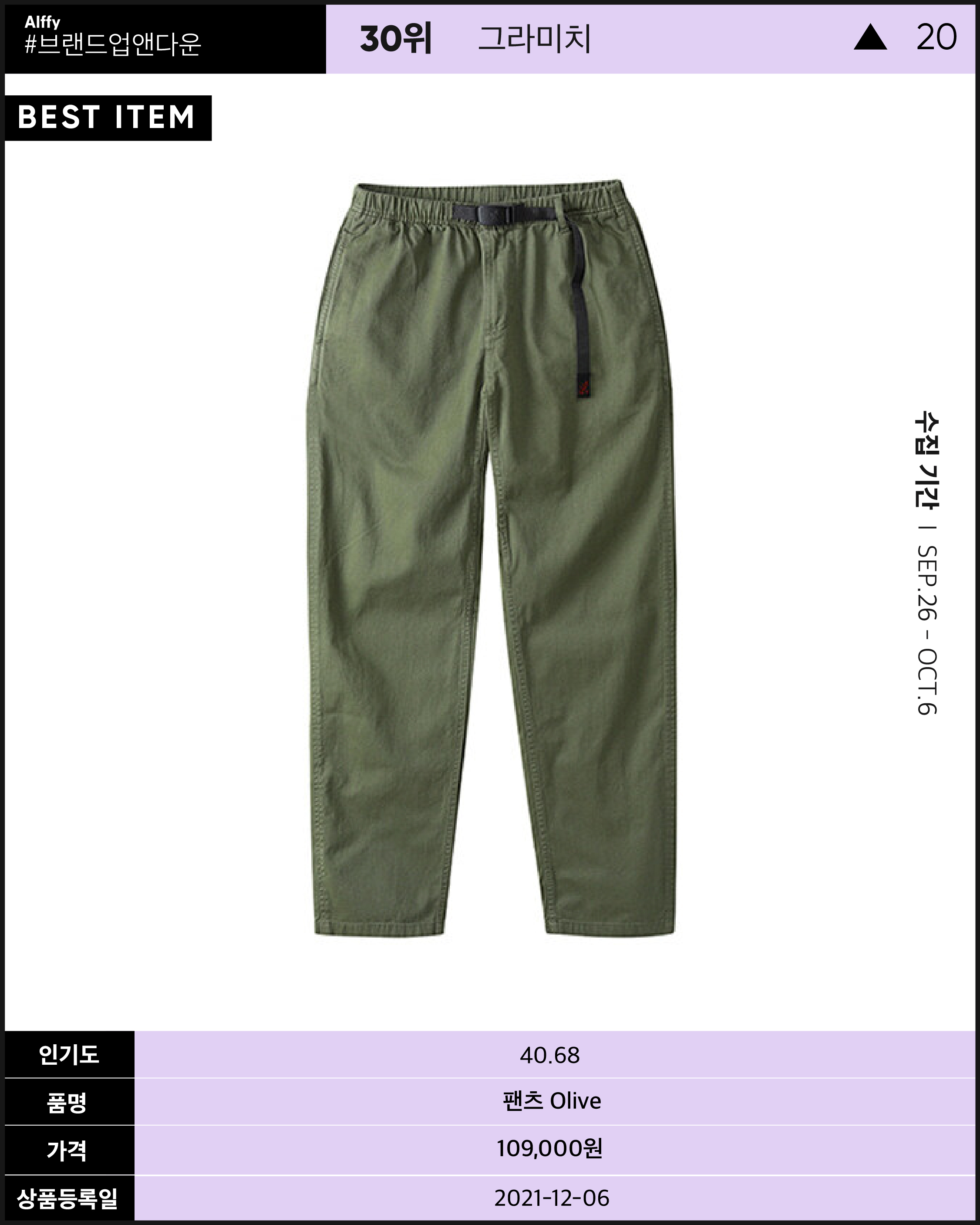 또 다른 팬츠 맛집 그라미치도 20계단이나 상승하며 30위권 내에 턱걸이로 진입했는데요. 비슬로우와 동일하게 한 가지 모델에 인기가 집중돼 있습니다. 시즌리스로 전개하는 루즈테이퍼트 팬츠가 환절기에 적당한 두께감과 편안한 착용감으로 많은 사랑을 받고 있습니다.